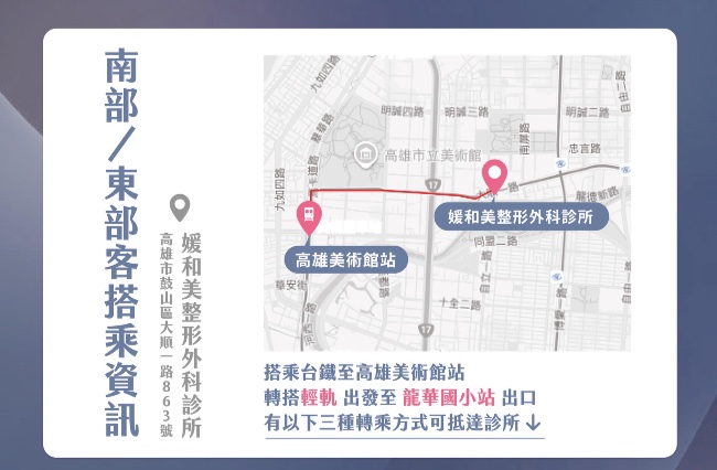 - 下車搭計程車至媛和美整形外科診所-高雄市左營區大順一路863號(約2~3分鐘)。